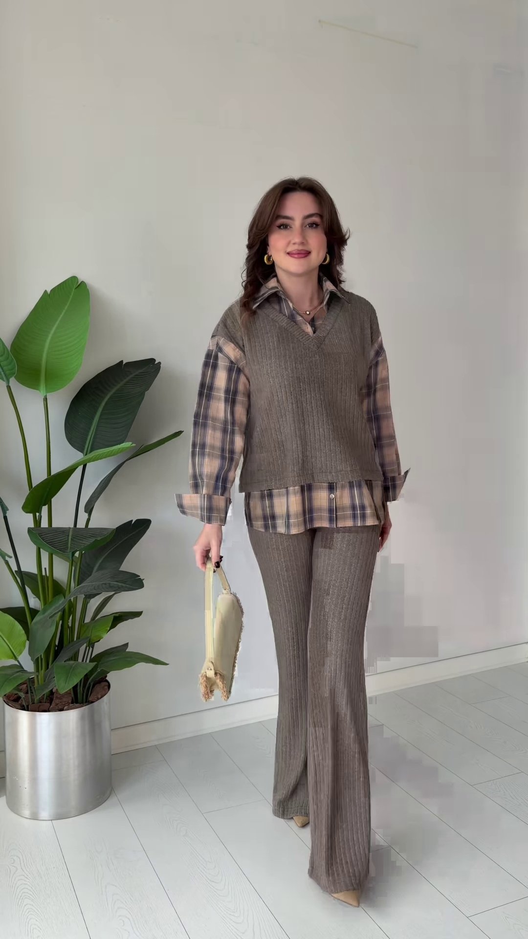 This set includes a ribbed knit sleeveless vest, matching flared knit pants, and a plaid button-down shirt. The layered look offers versatility — wear it together for a coordinated outfit or mix and match with other wardrobe staples.